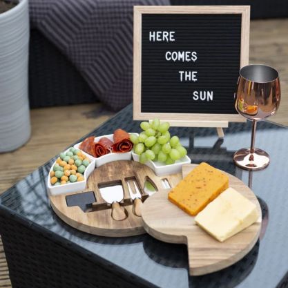 Pateicoties salokāmajam dizainam, dēlis ļauj ērti uzglabāt nažus zem tā, ļaujot viesiem pašiem sagriezt sieru.