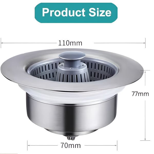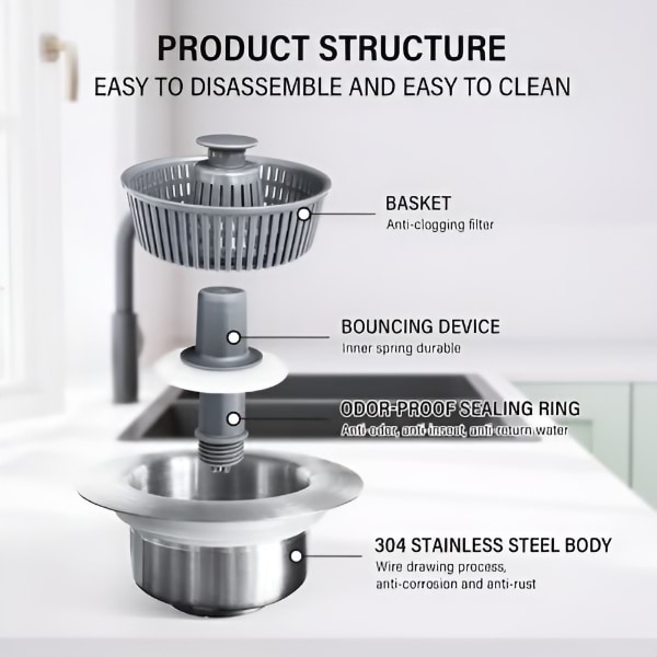 Šis “viss vienā” risinājums darbojas kā sietiņš, aizbāzni un smaku filtrs – lai jūsu izlietne būtu tīra, sausa un bez smakām.