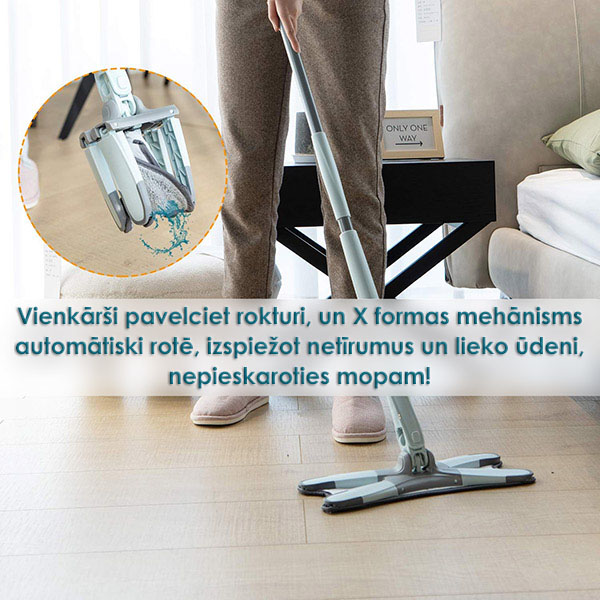Grīdu mazgāšana agrāk bija netīra un laikietilpīga—vairs ne. Šī mopa konstrukcija samazina tīrīšanas laiku uz pusi! Noslaukiet putekļus, netīrumus un izšļakstījumus ar vienu vilcienu.